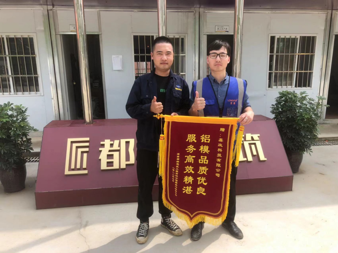 如今,奕盛谷峰項目首批次2#、3#樓均已完成鋁模施工任務,在吳啟及鋁模班組的共同努力下,兩棟樓的施工進度及質量均得到客戶方的高度認可,他們專門為吳啟送來感謝信及錦旗。