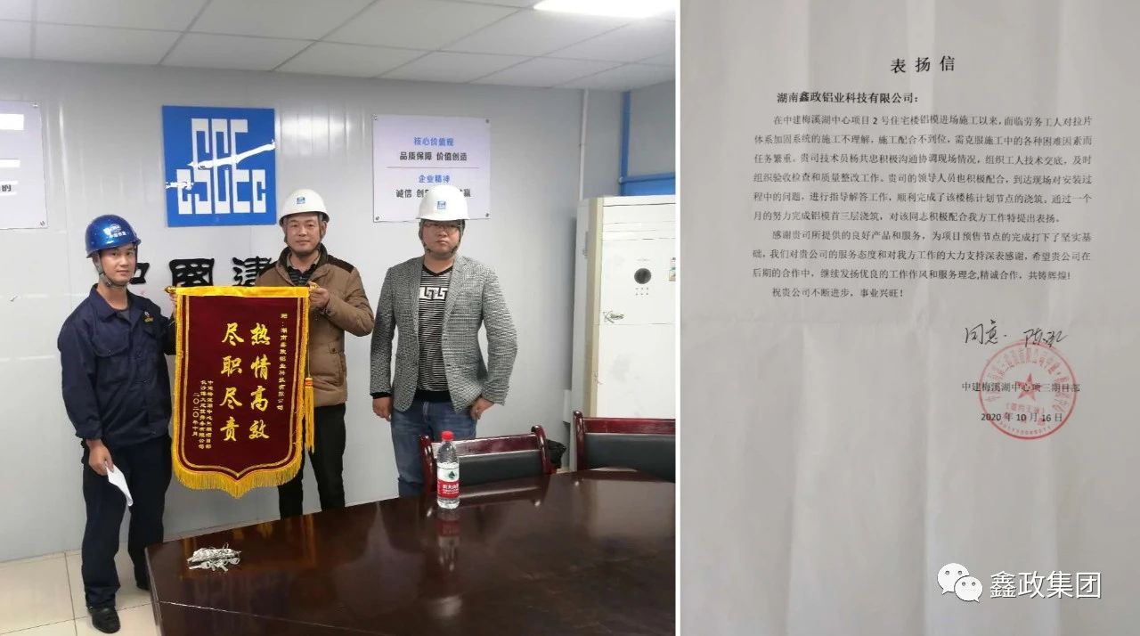 瀏覽次數:1186近日,中建五局第三建設有限公司中建梅溪湖中心項目部和現場勞務公司長沙博大建筑勞務有限公司送來錦旗和表揚信,對鑫政鋁業技術服務科楊共忠在項目上的出色表現給予了充分肯定和高度評價。_20250530091630A310.jpg)
